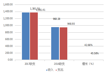 2017年度财政拨款收入:1381.33万元,支出:1381.41万元。与2016年相比,财政拨款收入增加413.05万元,增长42.66%;支出增加435.48万元,增长45.58%。