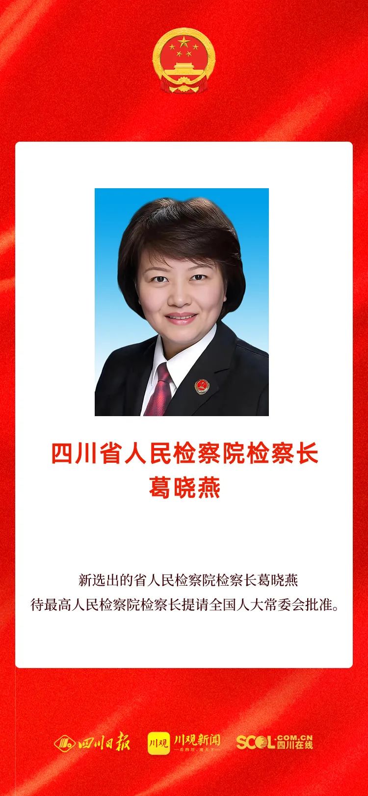 1月15日下午举行的四川省第十四届人民代表大会第一次会议第三次全体会议,选举葛晓燕为省中信精彩365_365彩票app下载苹果版_英国beat365官方登录检察长,新选出的省中信精彩365_365彩票app下载苹果版_英国beat365官方登录检察长葛晓燕,待最高中信精彩365_365彩票app下载苹果版_英国beat365官方登录检察长提请全国人大常委会批准。