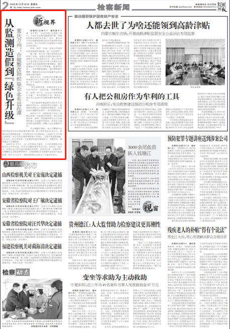 2022年12月30日,《检察日报》第2版刊登《从监测造假到“绿色升级”——重庆万州:合规整改助织染企业走出泥潭》一文,内容如下: