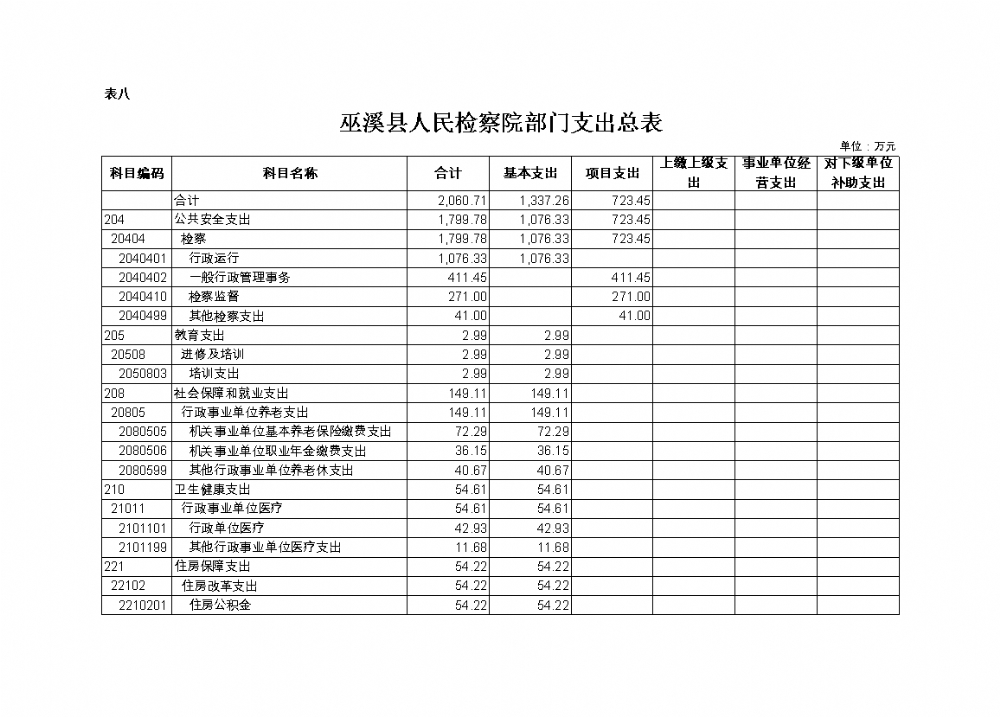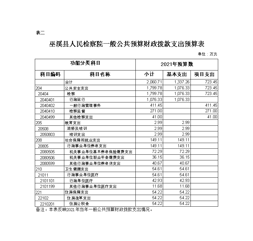 (二)支出预算:2021年年初预算数2060.71万元,其中:公共安全支出1799.78万元,教育支出2.99万元,社会保障和就业支出149.11万元,卫生健康支出54.61万元,住房保障支出54.22万元。支出预算较去年减少1149.68万元,主要是基本支出预算增加121.87万元,项目支出预算减少1271.55万元。