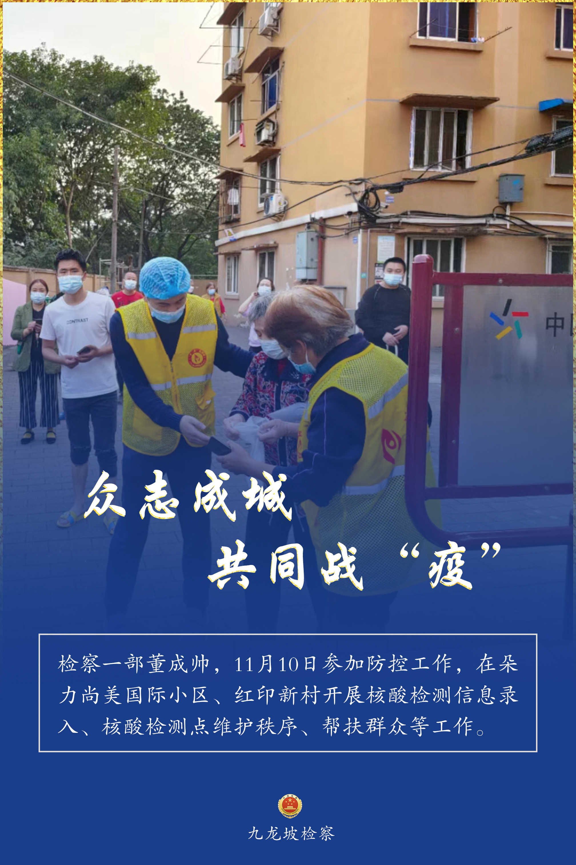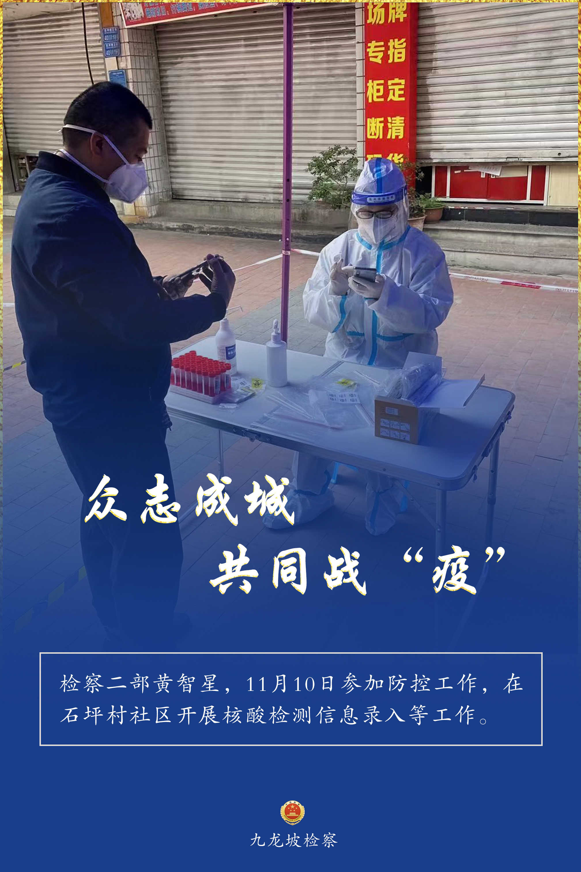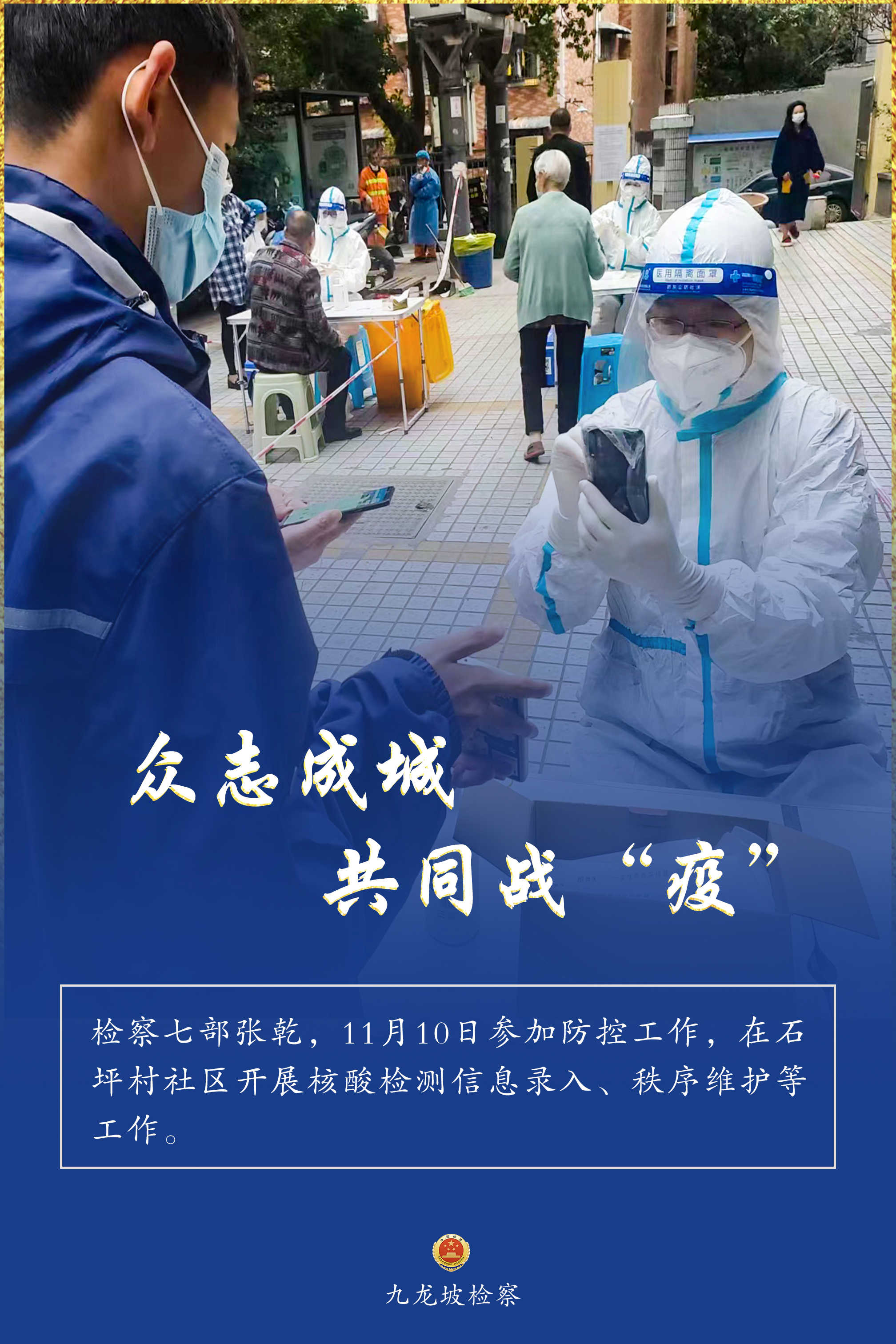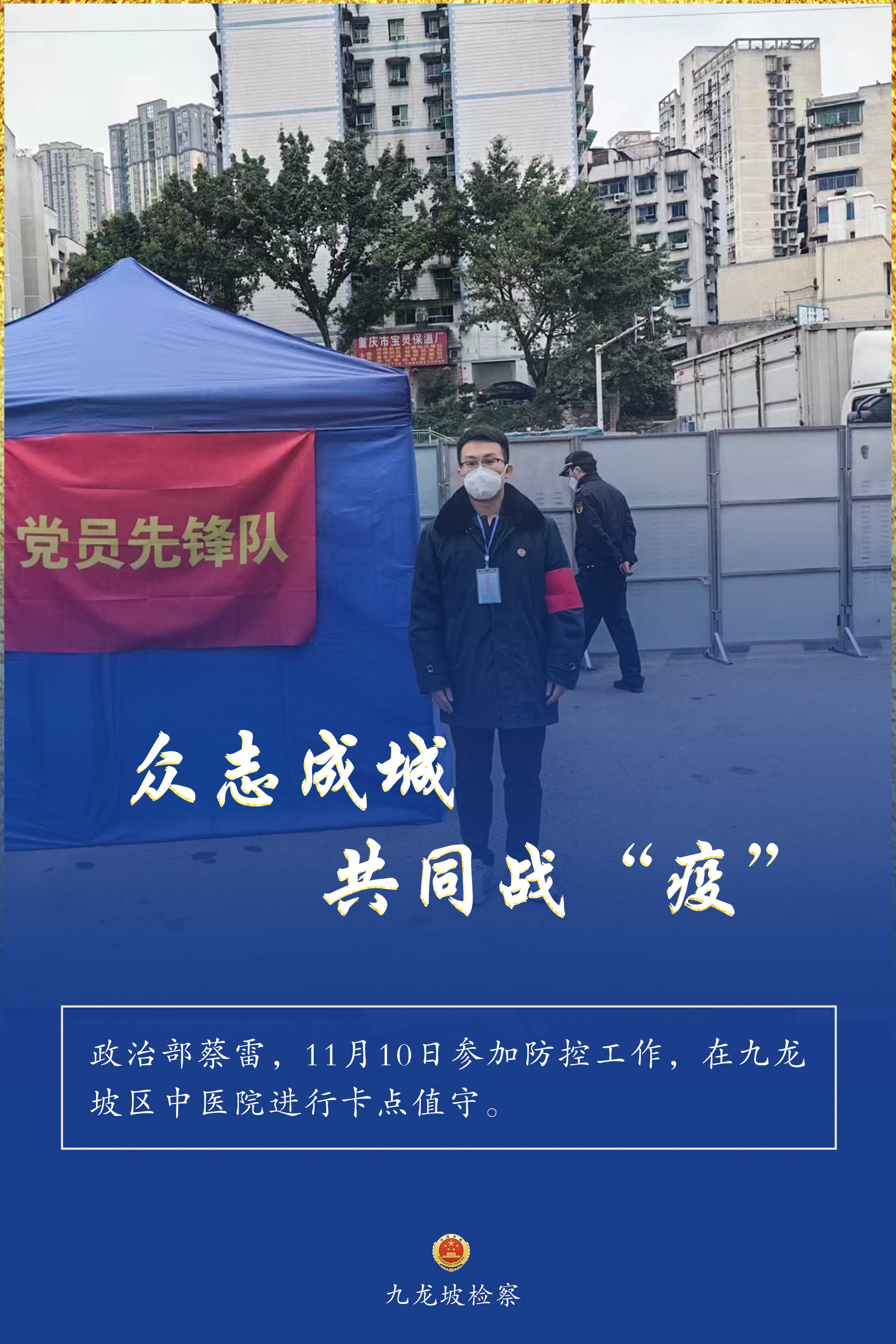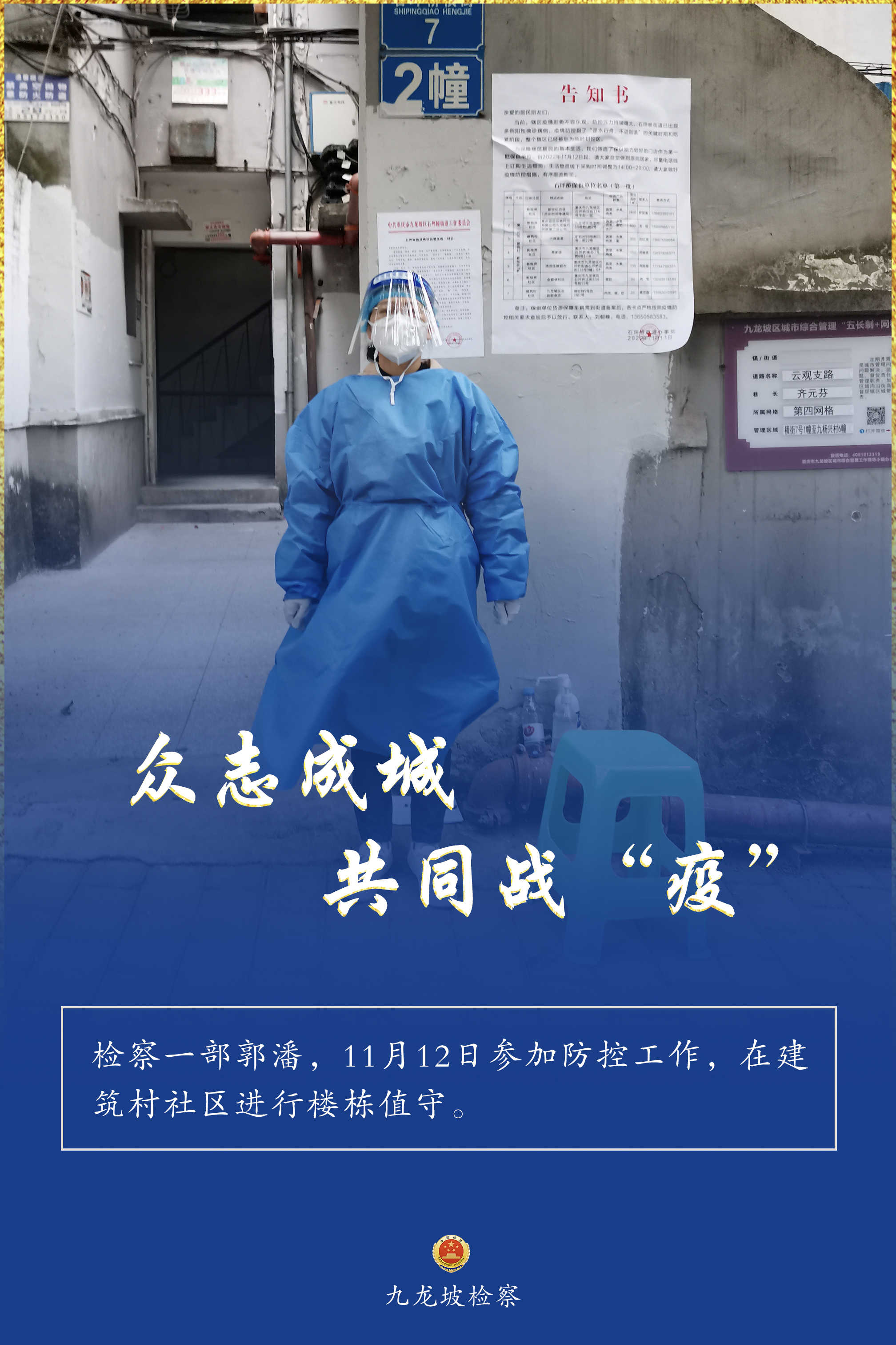 连日来,九龙坡区疫情防控形势复杂严峻。九龙坡区检察院疫情防控志愿者们,他们始终坚守一线、不畏险阻,他们的身影活跃在疫情防控的各个环节,与街道、社区工作者们并肩奋战、共同战“疫”,为全区疫情防控工作增添一抹“检察蓝”,用实际行动诠释着检察人的使命担当。
