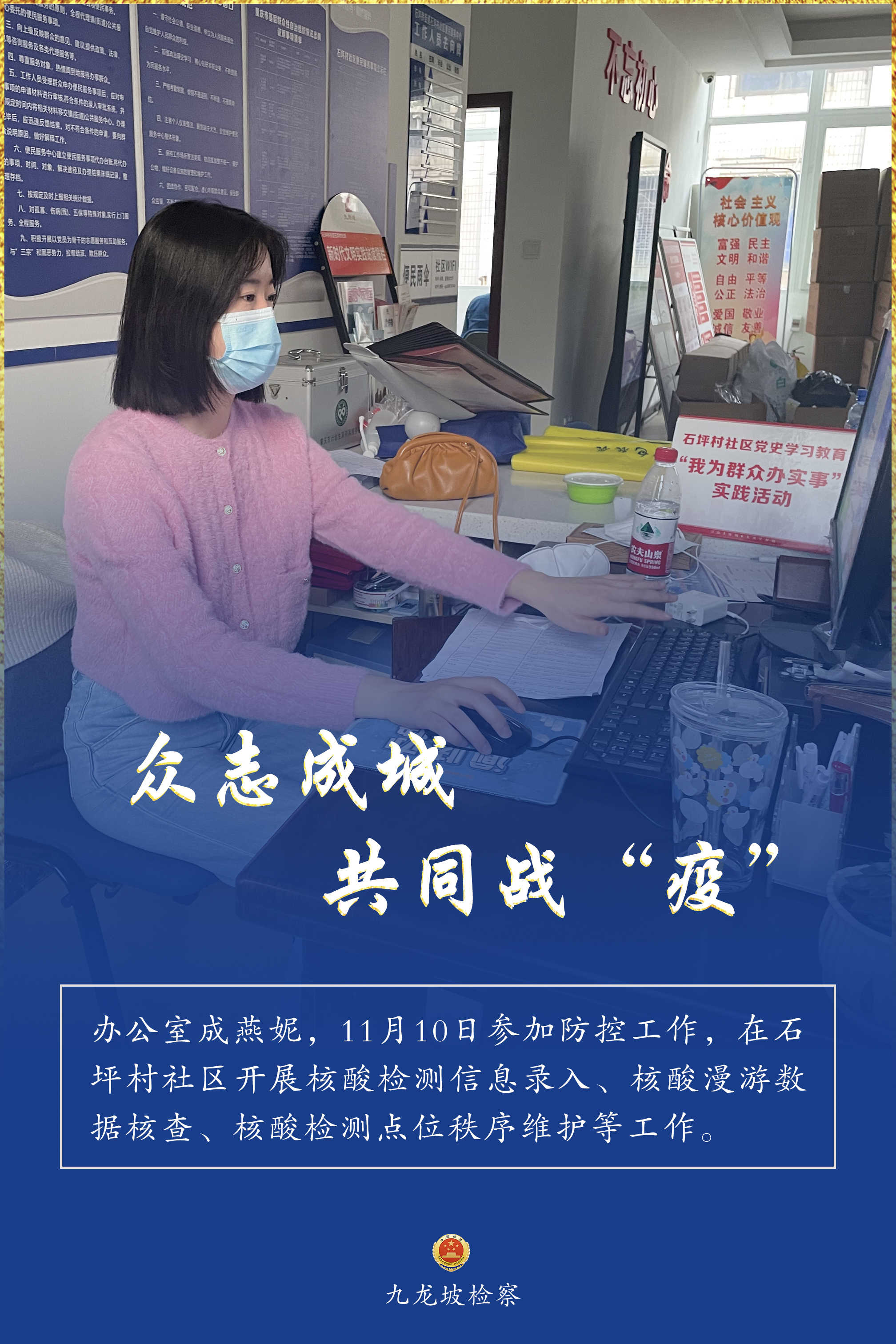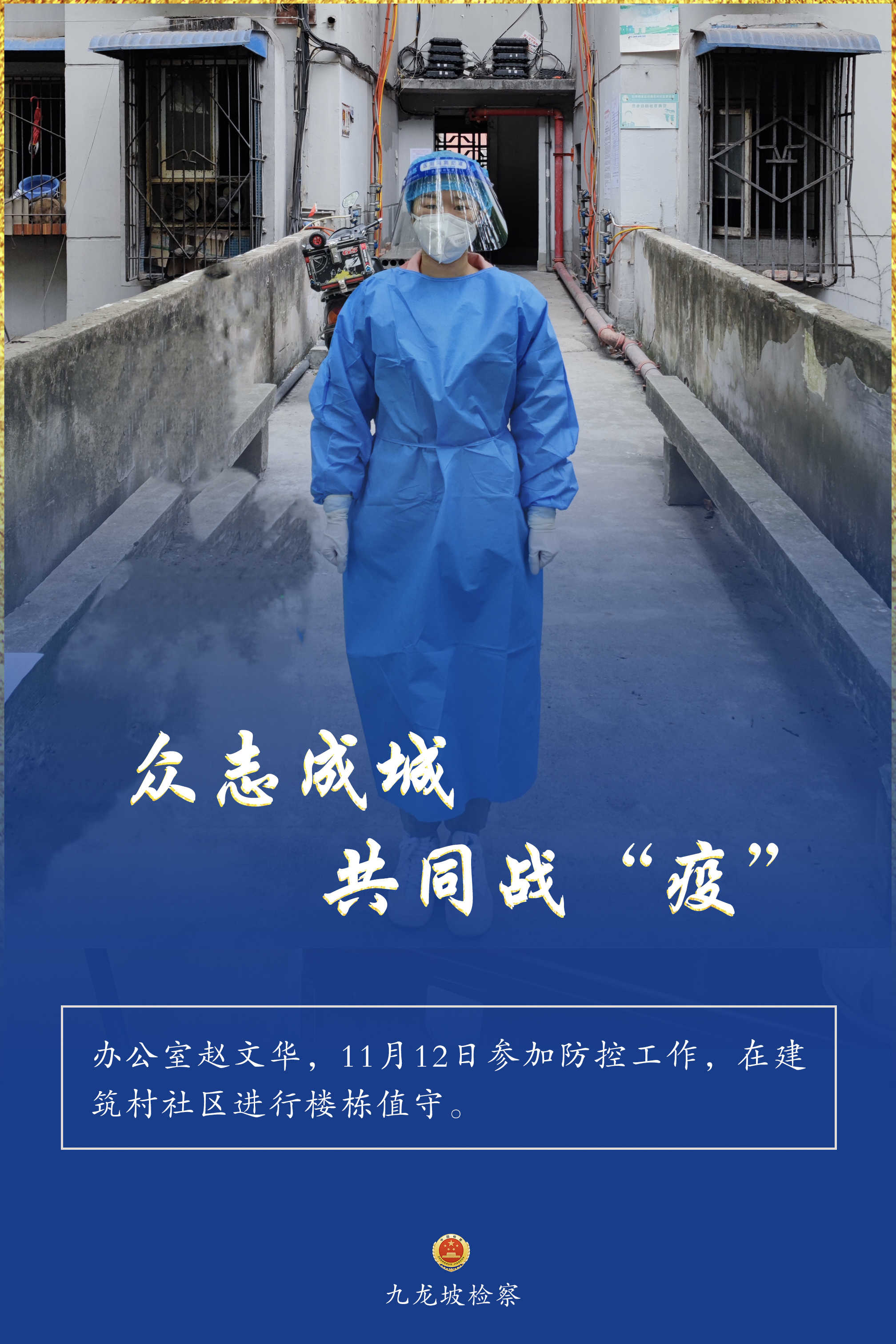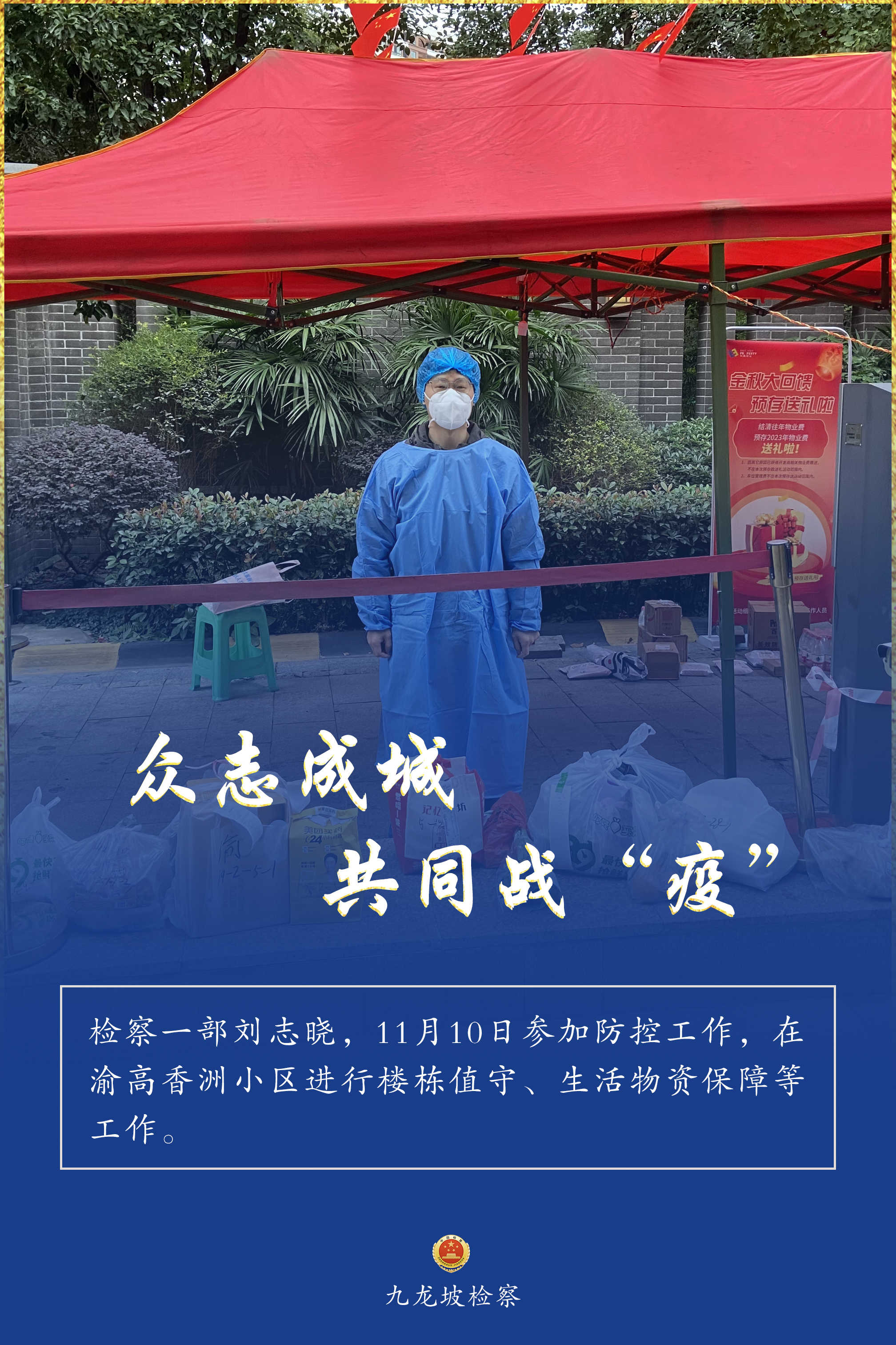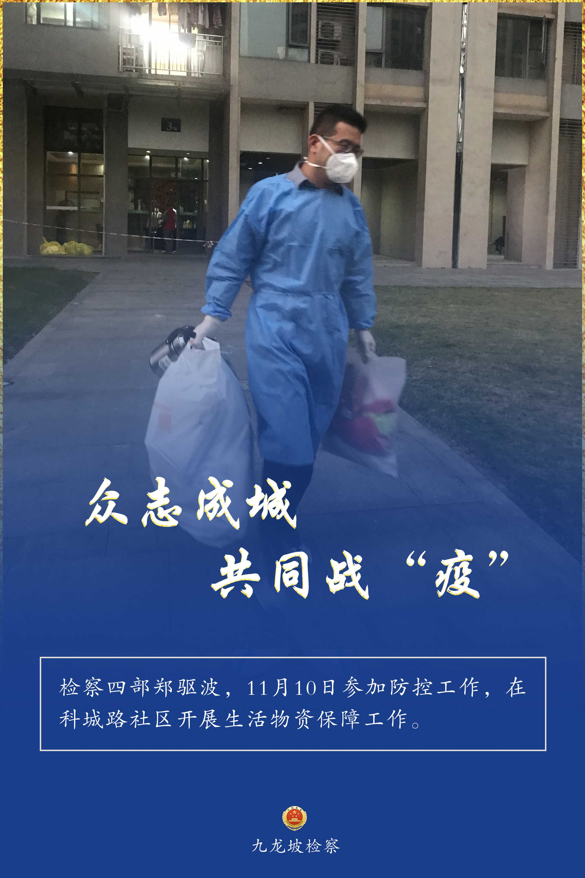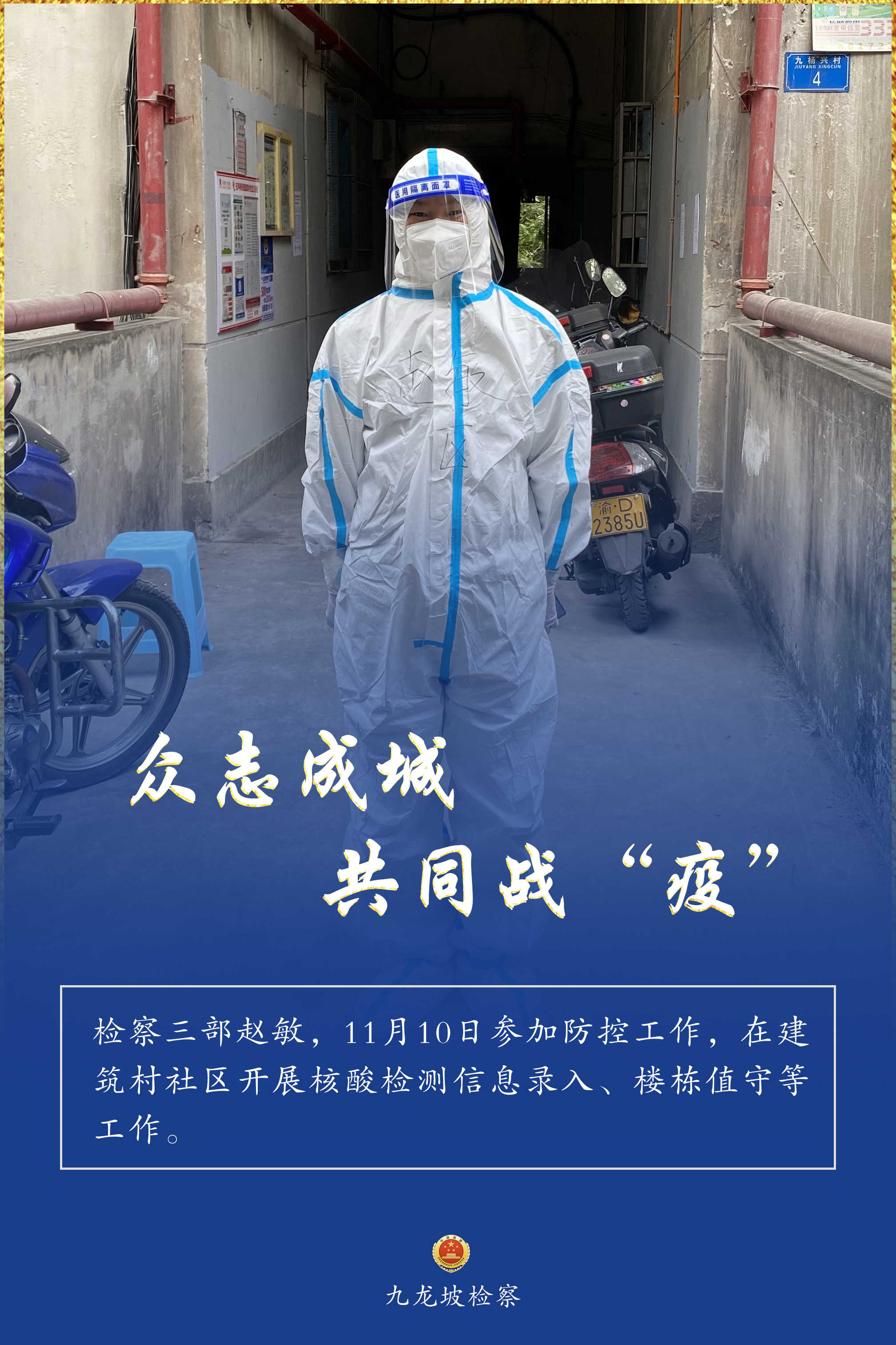 连日来,九龙坡区疫情防控形势复杂严峻。九龙坡区检察院疫情防控志愿者们,他们始终坚守一线、不畏险阻,他们的身影活跃在疫情防控的各个环节,与街道、社区工作者们并肩奋战、共同战“疫”,为全区疫情防控工作增添一抹“检察蓝”,用实际行动诠释着检察人的使命担当。