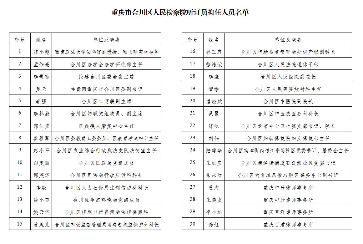 根据《重庆市合川区中信精彩365_365彩票app下载苹果版_英国beat365官方登录听证员选任方案》,经研究决定,拟选任陈小彪等30名同志为重庆市合川区中信精彩365_365彩票app下载苹果版_英国beat365官方登录听证员人选。为充分发扬民主,广泛接受监督,现将名单予以公示,公示期为5个工作日(2022年6月16日至2022年6月22日).