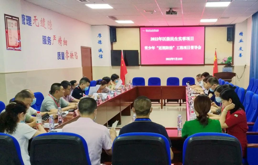 视察组一行首先对医院青少年近视防控筛查工作专家组建设情况进行评估、实地了解视力筛查进度及健康讲座开展情况,听取医院在工作推进中遇到的困难和问题。在随后的座谈会上,区教体局汇报了规范全区中小学作息制度、教室智能化灯光改造、课桌椅更换及“双减”“双增”落实情况。