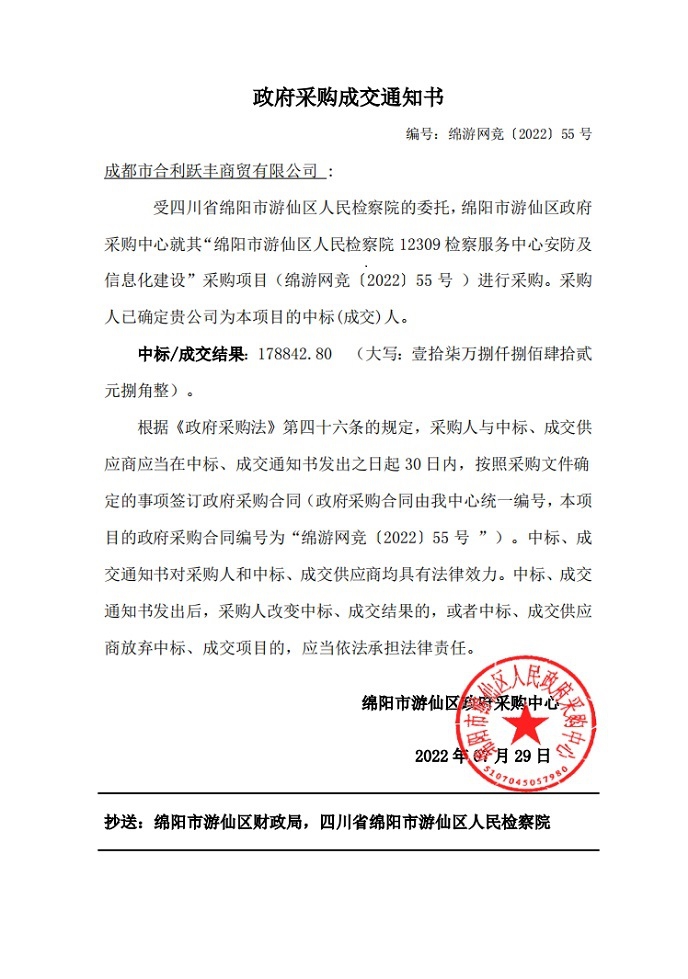 绵阳市游仙区中信精彩365_365彩票app下载苹果版_英国beat365官方登录12309检察服务中心安防及信息化建设采购成交通知书