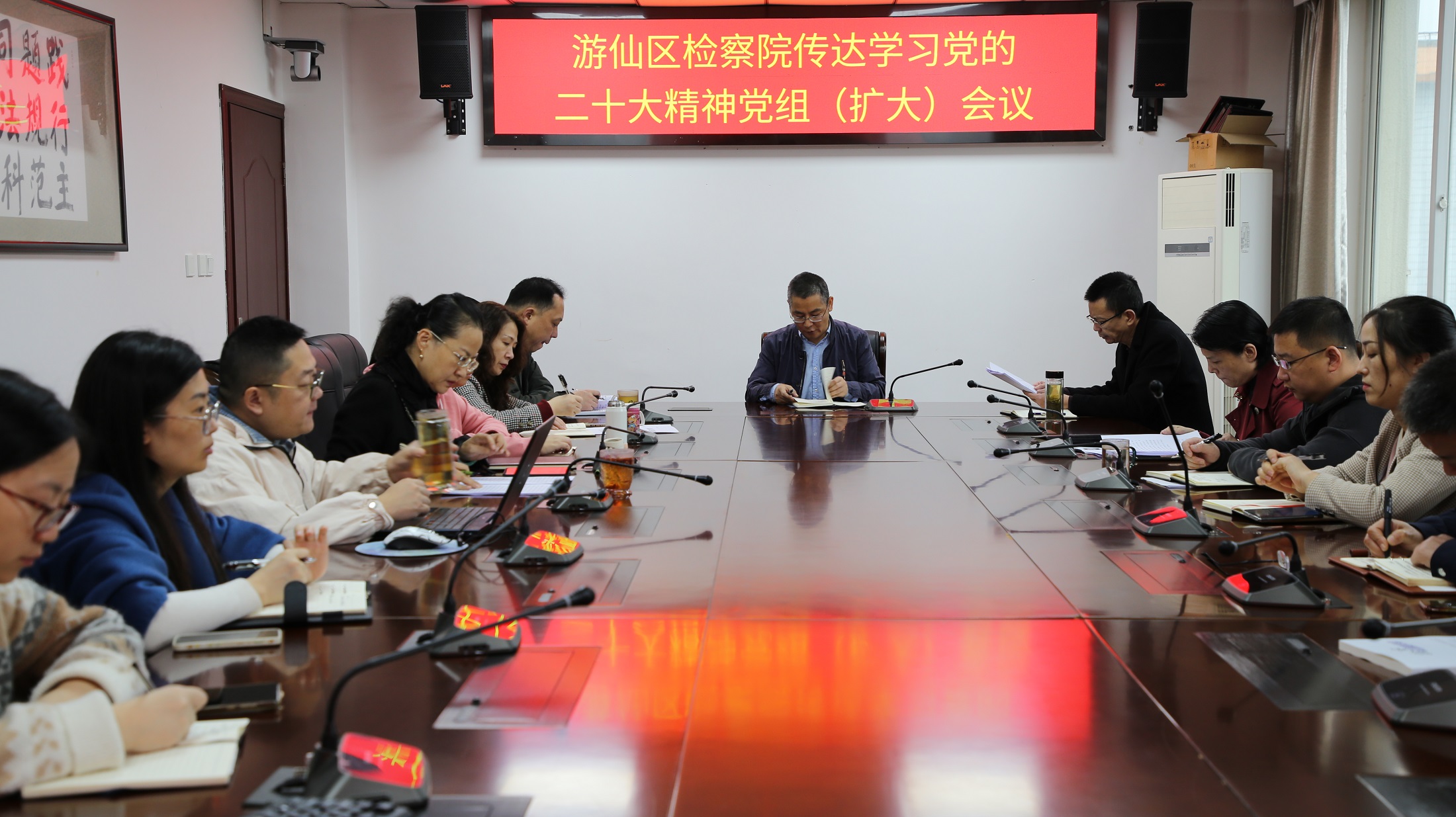 10月28日,我院召开党组(扩大)会议,深入学习领会党的二十大精神、新修订党章和省委、市委、区委学习贯彻党的二十大精神系列会议精神。会议上,我院党组书记、检察长王智君号召全体检察干警要把学习宣传贯彻党的二十大精神作为当前和今后一个时期的重大政治任务,更加自觉把忠诚拥护“两个确立”、坚决做到“两个维护”落实到检察工作各方面全过程,紧紧围绕新时代新征程党的使命任务,不断将学习成效扎实体现在有力检察履职上;特别是深入学习贯彻习近平法治思想,深入贯彻《中共中央关于加强新时代检察机关法律监督工作的意见》,围绕服务保障游仙“三大目标”“三大战略”“三大攻坚”的总体谋划和加快构建“一主一副、一极多支、全域协同”区域新发展格局做细做实各项检察举措;要认真践行以人民为中心的发展思想,进一步加强民生司法保障,坚持全面从严治检不动摇,打造忠诚干净担当的检察铁军,为建设更高水平的平安游仙、法治游仙提供更优检察智慧和更大检察力量