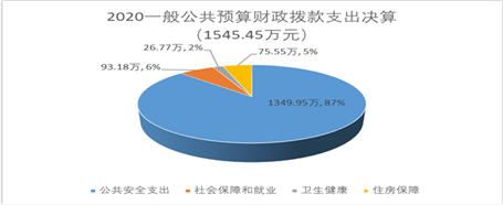2020年一般公共预算财政拨款支出1545.45万元,主要用于以下方面:公共安全支出1349.95万元,占87 %;社会保障和就业支出93.18万元,占6%;卫生健康支出26.77万元,占2%。住房保障支出75.55万元,占5%。