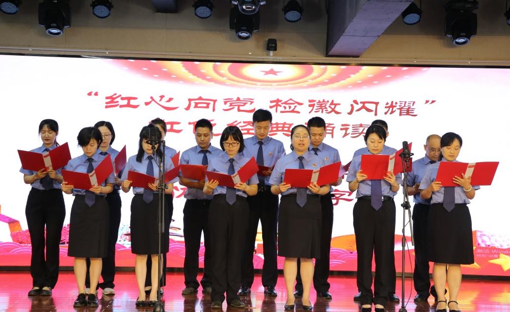 党课结束后,大会举办了“红心向党 检徽闪耀”红色经典诵读,在庄严悦耳的旋律中,四个支部分别诵读了《闪亮的名字》《放飞中国梦》《可爱的中国》《波澜壮阔一百年》等作品,一起重温伟大共产党的百年历程,领悟中国共产党人的崇高品格,抒发对党的无限热爱。