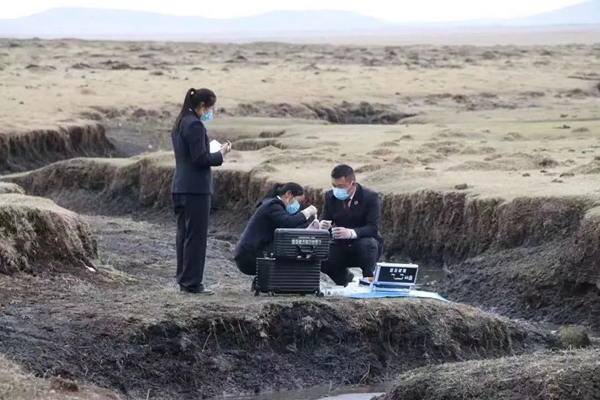 若尔盖县检察院“鹤翔兰萨”公益诉讼办案团队开展水源地水质勘测。