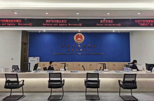 天府中央法务区检察服务中心设有知识产权刑事案件“双报点”专门窗口(右一)。