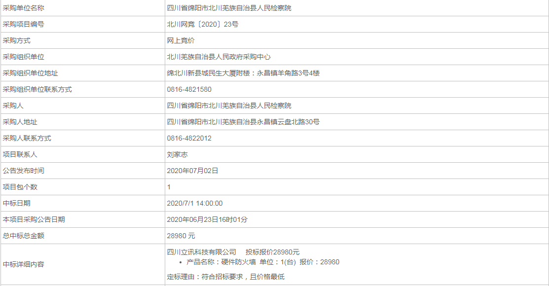采购硬件防火墙(第二次)(北川网竞〔2020〕23号 )