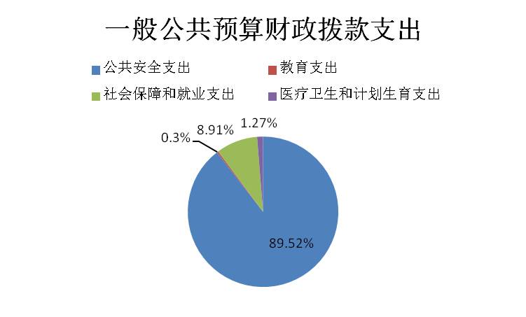 2017年一般公共预算财政拨款支出2709.1万元,主要用于以下方面: 公共安全支出2425.1万元,占89.52%,教育支出8.26万元,占0.3%,社会保障和就业支出241.42万元,占8.91%,医疗卫生和计划生育支出34.32万元,占1.27%。
