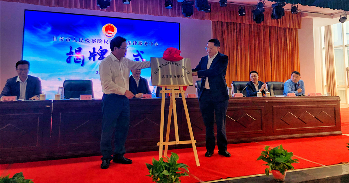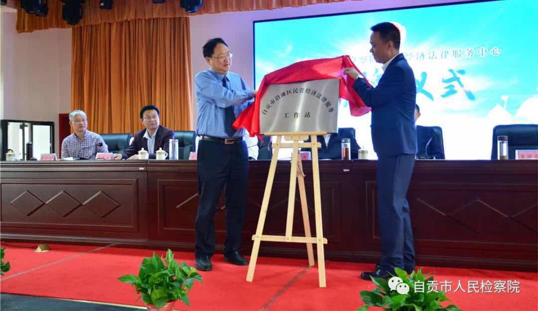 市人大常委会副主任詹勇、市政协副主席王孝谦共同为市检察院民营经济法律服务中心揭牌;市检察院党组书记、检察长黄国清,沿滩区委副书记、区长易冬共同为沿滩区民营经济法律服务工作站揭牌。